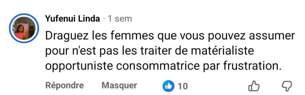 Pour les hommes, lorsqu’ils sont financièrement stables, ils peuvent se mettre en couple avec n’importe quelle femme. Ils n’exigent pas une femme financièrement au même niveau qu’eux car c’est pas le matériel qui est leur priorité. Pour les femmes, lorsqu’elles sont stables financièrement, elles pensent qu’elles ne devraient pas se mettre en relation avec un homme moins nantis. Un homme pauvre car selon leurs commentaires sur la publication objet de cet article, celui-ci viendrait baisser leur niveau de vie. Elles pensent que “chacun devrait accrocher son sac où il peut décrocher“.