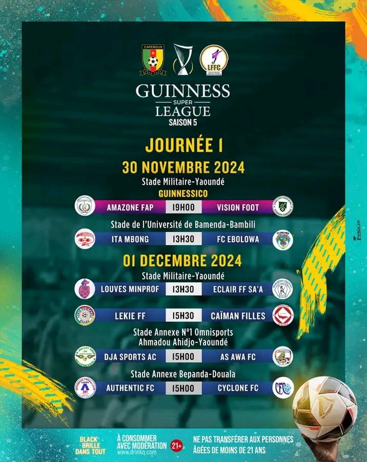 La saison 5 de la Guinness Super League démarre sur les chapeaux de roues avec des affiches prometteuses dès la première journée. Au cœur de l’action, le “Guinnessico”, opposant Amazone FAP à Vision Foot Academy, se tiendra le samedi 30 novembre 2024 au Stade Militaire de Yaoundé à 19h. Ce match d’ouverture, synonyme de spectacle et d’intensité, promet d’enflammer les tribunes.