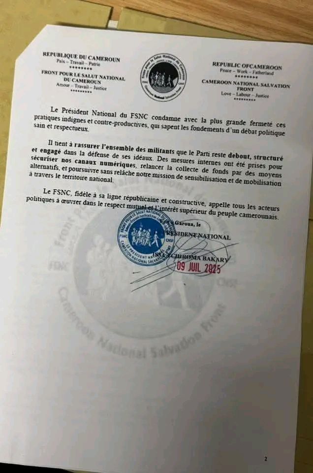 Dans un contexte politique camerounais en pleine effervescence, le Front pour le Salut National du Cameroun (FSNC), dirigé par l’ancien ministre Issa Tchiroma Bakary, a fermement dénoncé des “manœuvres de déstabilisation” et des “actes de sabotage” ciblant le parti. Ce communiqué, daté du 9 juillet 2025, intervient alors que M. Tchiroma Bakary vient de rompre une alliance de longue date avec le pouvoir en place pour se lancer dans la course à la présidentielle d’octobre 2025, promettant une ère de renouveau pour le Cameroun.