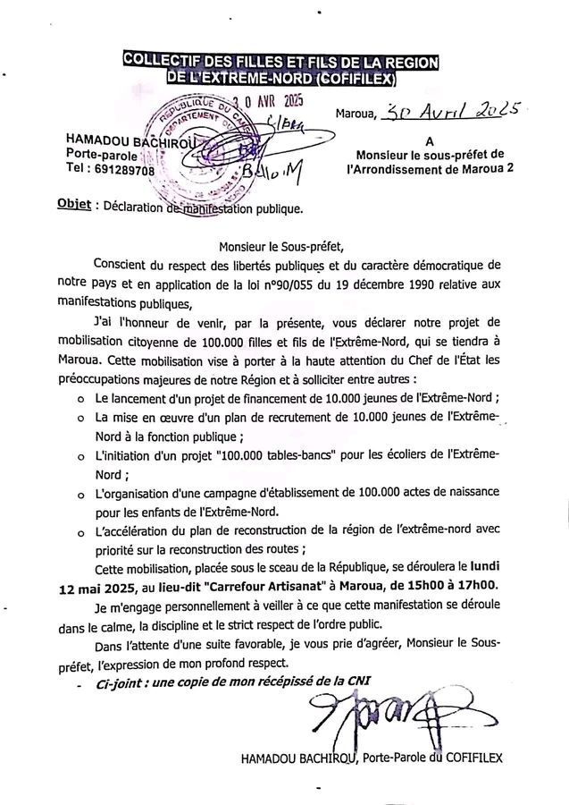 Dans une correspondance adressée au Sous-préfet de Maroua 2, le porte-parole du collectif, Hamadou Bachirou, a précisé les axes majeurs de cette mobilisation, qui s’inscrit dans un esprit républicain et dans le respect des libertés publiques :