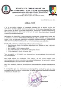 Dans un communiqué publié ce 20 novembre 2024, l’Association Camerounaise des Entraîneurs et Éducateurs de Football (ACEEF) a tenu à apporter des clarifications suite aux propos tenus par le sélectionneur national, Marc Brys, à l’issue du match Cameroun-Zimbabwe comptant pour les éliminatoires de la CAN Maroc 2025.