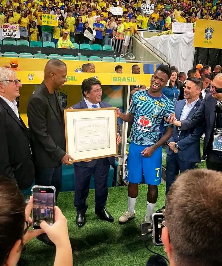 Accompagné de la Fédération brésilienne de football, Vinicius Jr a fièrement reçu un certificat attestant de ses racines camerounaises, témoignant de l’importance de l’histoire et de l’héritage dans le sport mondial.