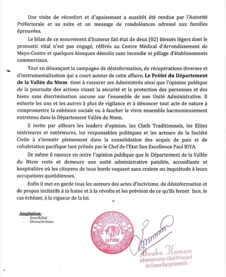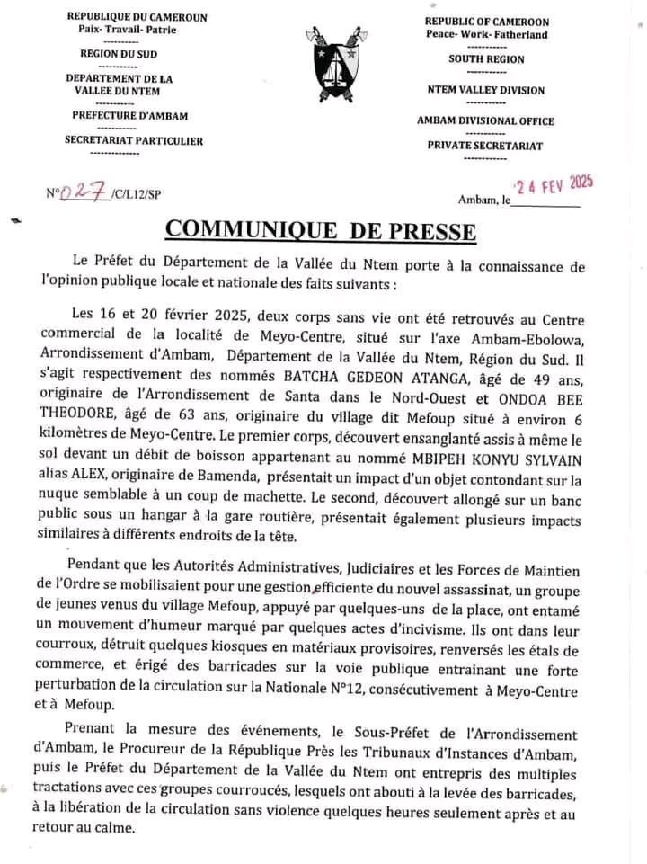 Face à ces assassinats, la population de Mefoup, soutenue par certains habitants de Meyo-Centre, a exprimé sa colère à travers des mouvements d’humeur : destruction de kiosques, fermeture de commerces et érection de barricades sur la route nationale N°12.